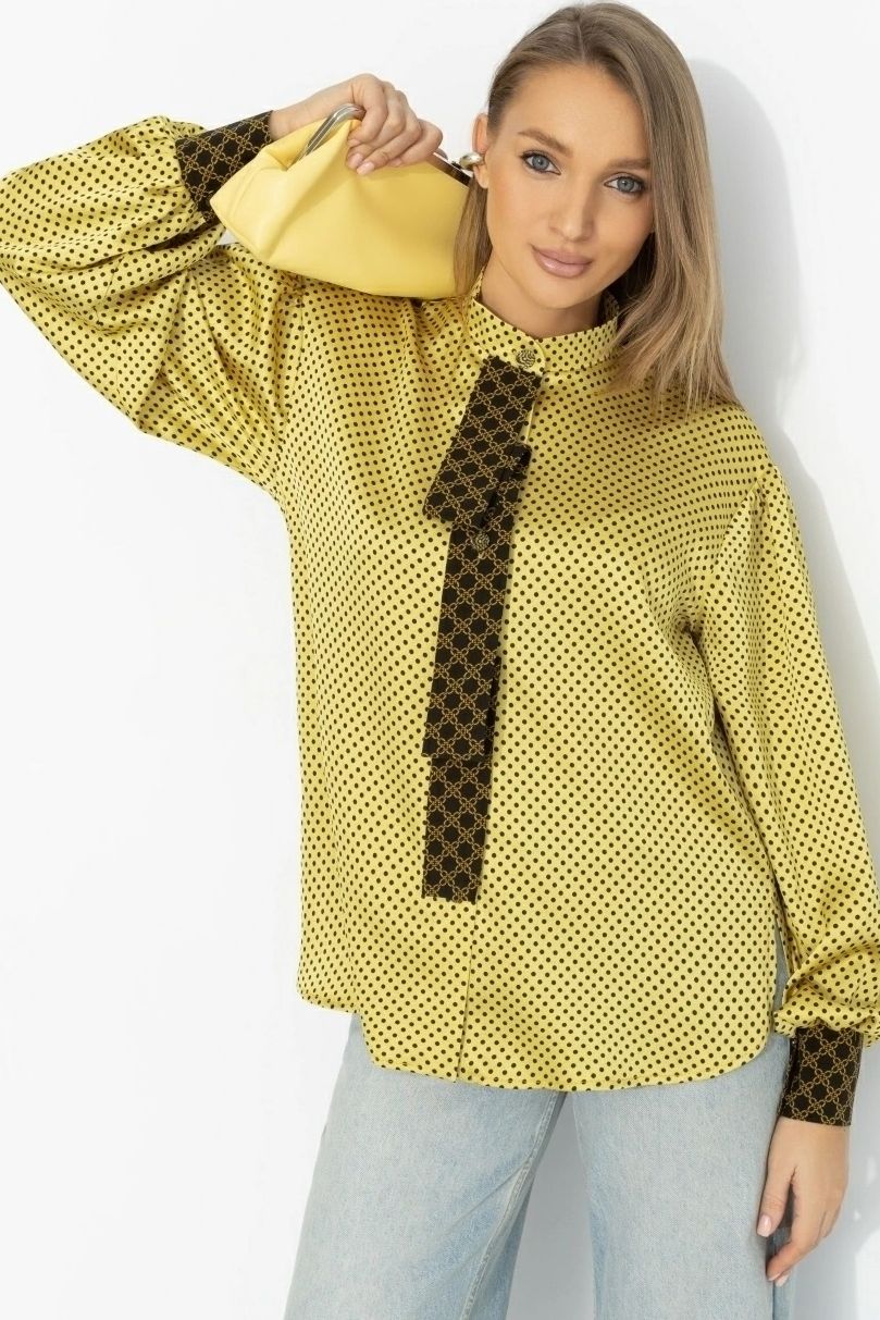 Рубашка атласная жёлтая в горошек от компании Charutti. Модель прямого силуэта, воротник-стойка, переходящий в оригинальную планку с застёжкой на петли и пуговицы. Втачные длинные рукава на манжетах, со спущенной линией плеча. Прекрасное решение для создания стильного образа.