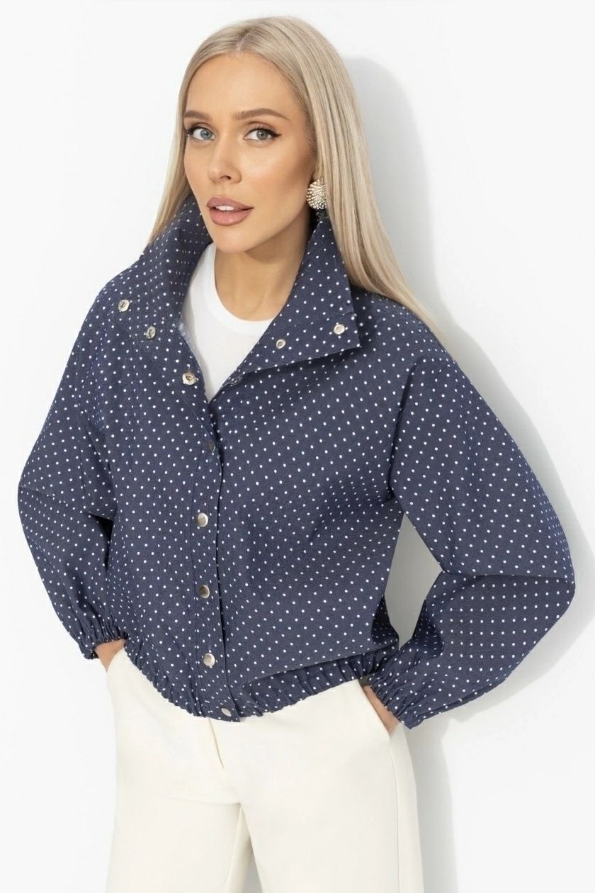 Ветровка синяя в горошек под джинсу от компании Charutti. Свободный крой, длинный рукав, застёжка на кнопки, карманы.Ткань плотная, но комфортная в движении, хорошо держит форму. Даже ветер сегодня играет на вашей стороне.