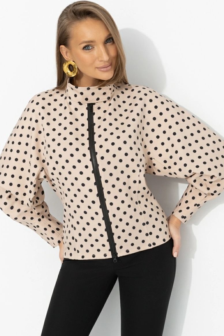 Жакет бежевый в горошек от компании Charutti, выполнен из костюмной ткани "креп". Дизайнерские рукава добавляют характер и драму. По переду застёжка на молнию. Идеальный выбор для создания женственного образа.