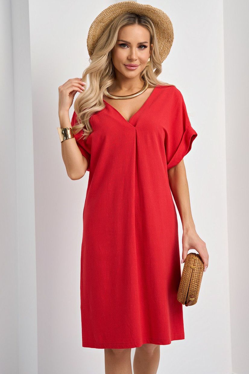 Платье красное льняное от компании Jetty. Модель прямого кроя, V-образный вырез горловины по переду и спинке. Короткие цельнокроеные рукава с отворотами. Идеальный выбор для создания женственного образа.