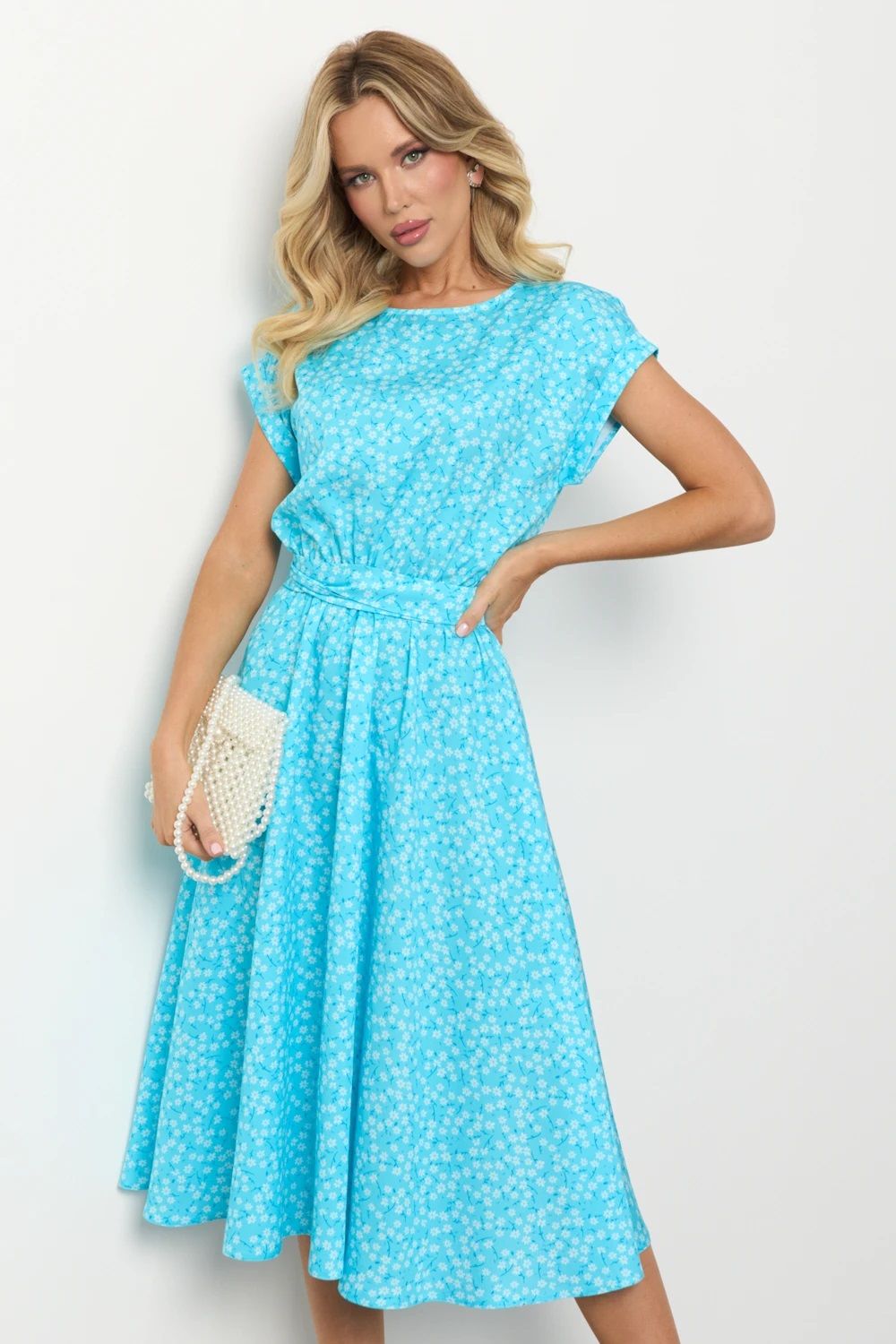 Платье миди голубое с цветочным принтом