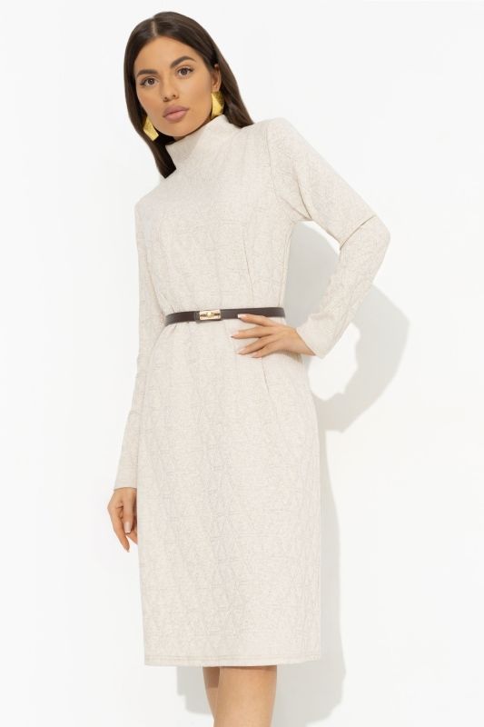 Платье прямое из трикотажа бежевого цвета от компании Charutti, выполнено из ткани "жаккард". Горловина оформлена воротником-стойка. Втачной длинные рукав. Платье без застежки. Изделие хорошо смотрится на любом типе фигуры. Это Ваш отличный образ, в котором вы всегда чувствуете себя уверенно. Ремень из экокожи в комплект не входит, продается отдельно.