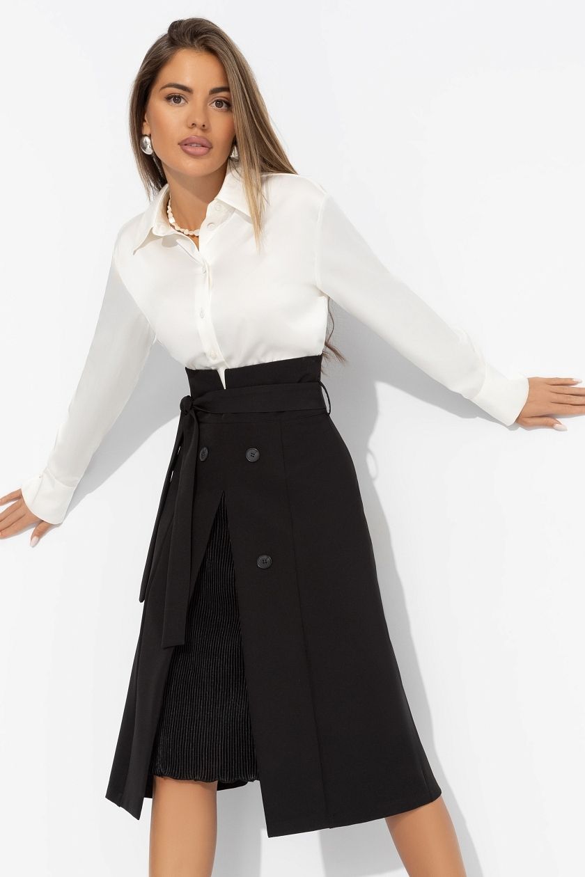 Юбка чёрная с имитацией многослойности от компании Charutti. Модель расклешённого силуэта, выполнена из комбинации двух видов ткани: «Барби», трикотаж «гофре». Посадка высокая на талии. Скрытая молния по спинке изделия. Есть пояс в тон изделия. Идеальный выбор на каждый день.