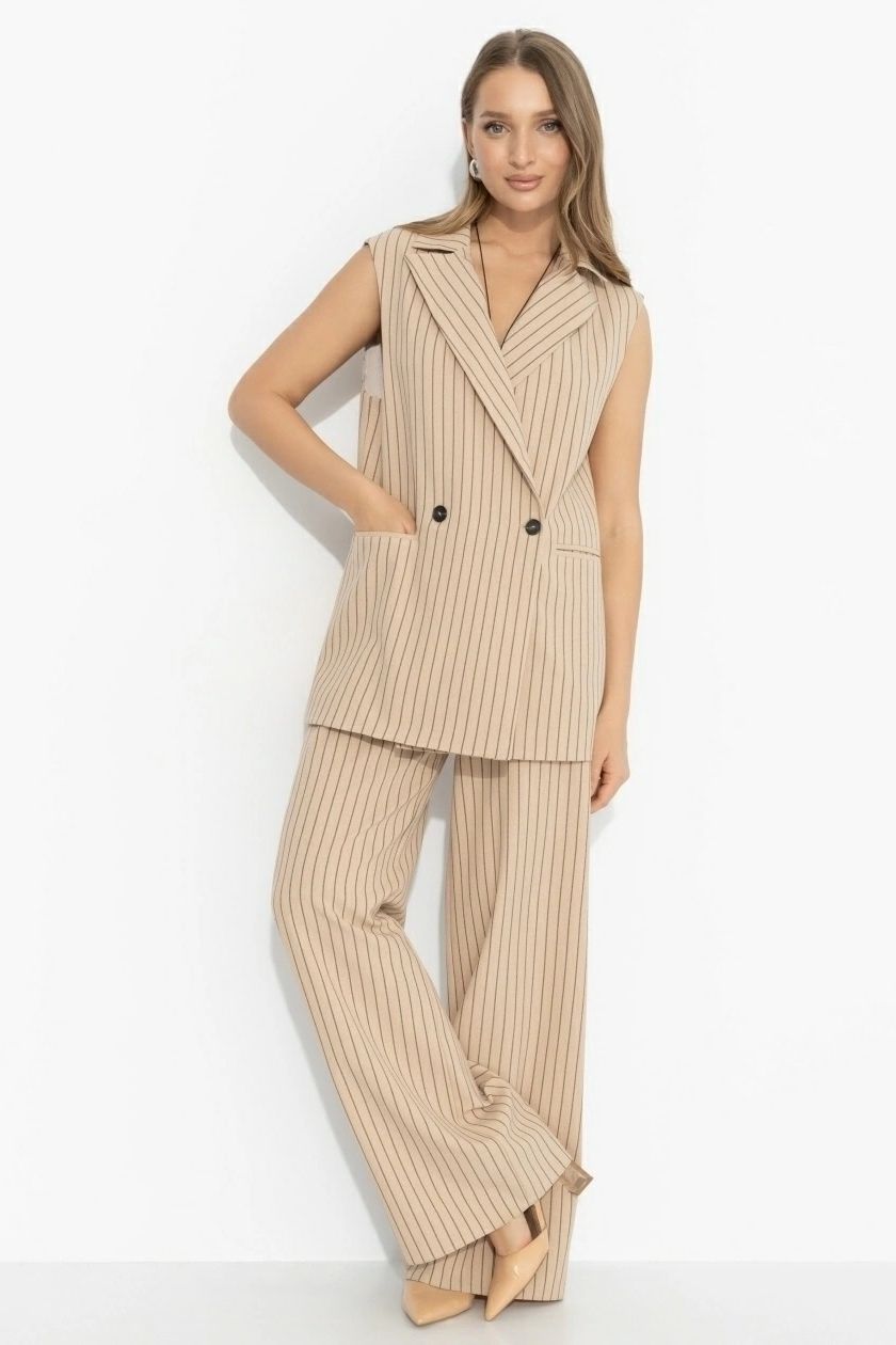 Костюм-двойка брючный бежевый в полоску от компании Charutti, выполнена из льна. Жилет прямого силуэта, отложной воротник с лацканами, переходящий в планку с застёжкой на петли и пуговицы, по переду карманы. Брюки прямого силуэта, притачной пояс на резинке, вбоковых швах карманы. Идеальный выбор для городских модниц.