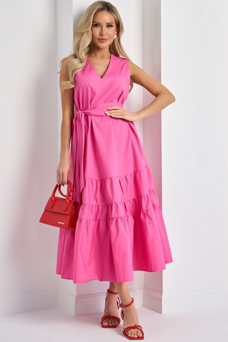 Платье длинное розовое без рукавов с поясом