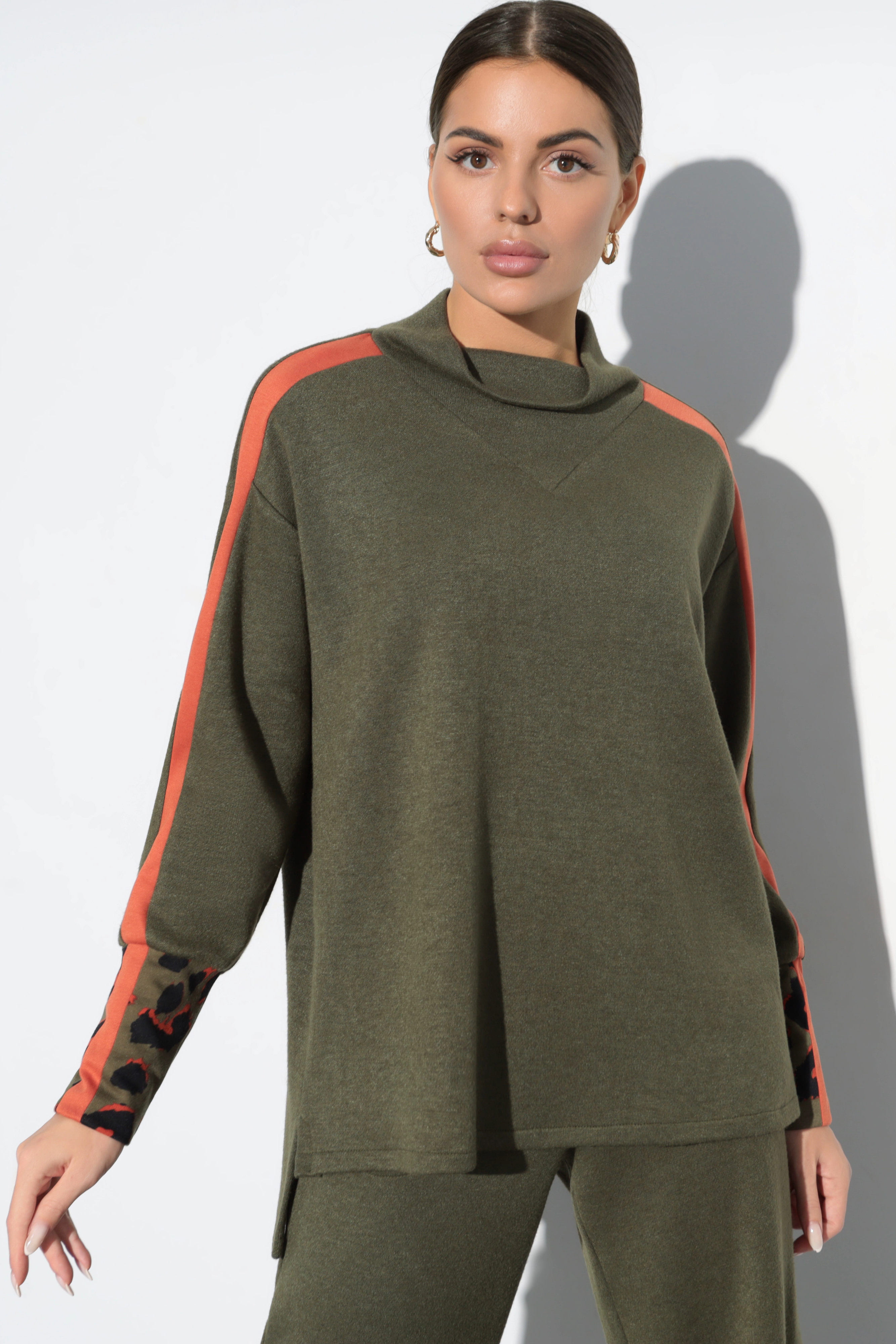 Зелёная женская туника от компании Charutti. Модель свободного силуэта, выполнена из трикотажа двухстороннего "евроангора". Воротник-стойка. Втачные длинные рукава, со спущенной линей плеча. Низ асимметричный, с разрезами. Идеальный выбор для создания женственного образа.